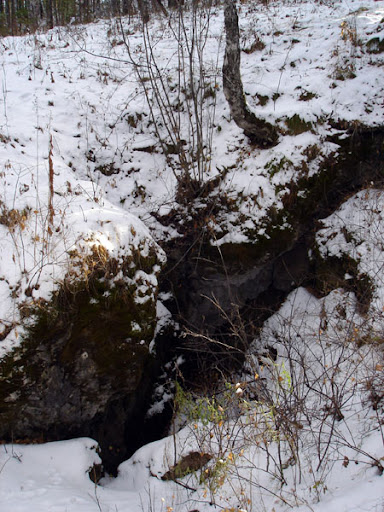 На глубине 10 метров есть наклонная площадка, образованная смерзшимися в монолит камнями, землей и корнями деревьев. С этого места шахта начинает расширяться, постепенно образуя свод грота.